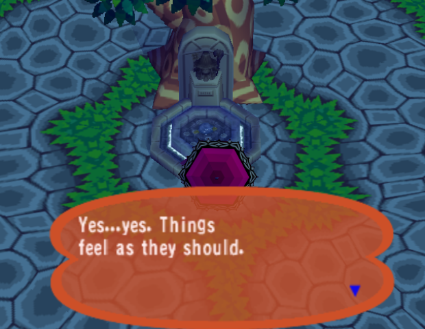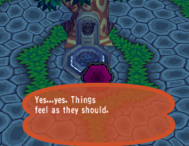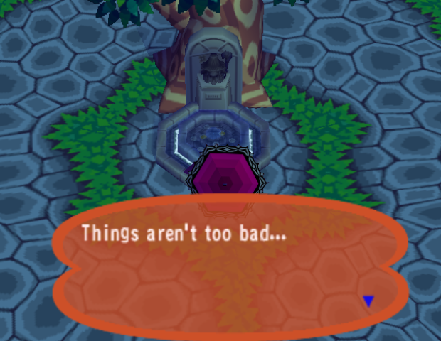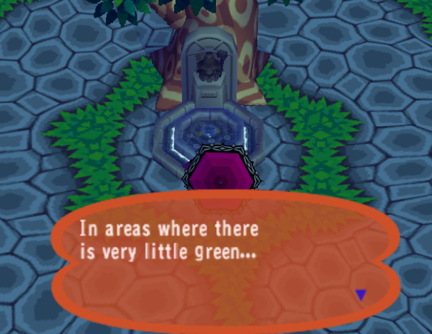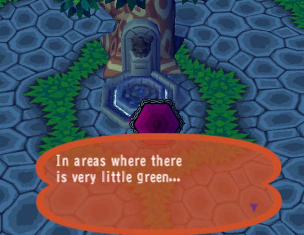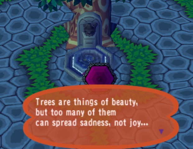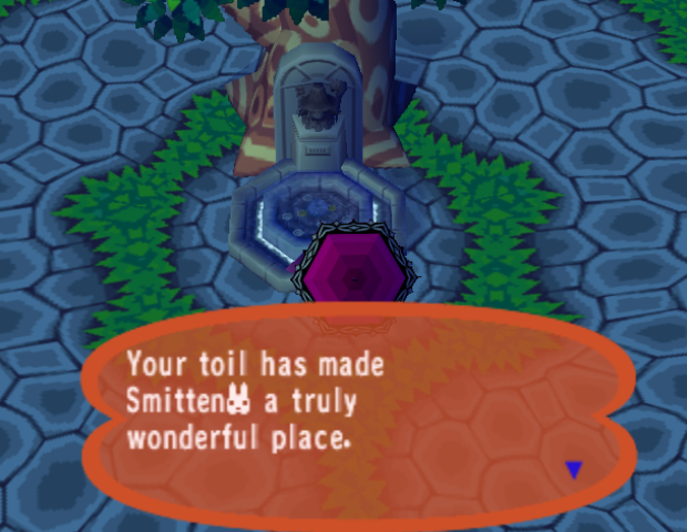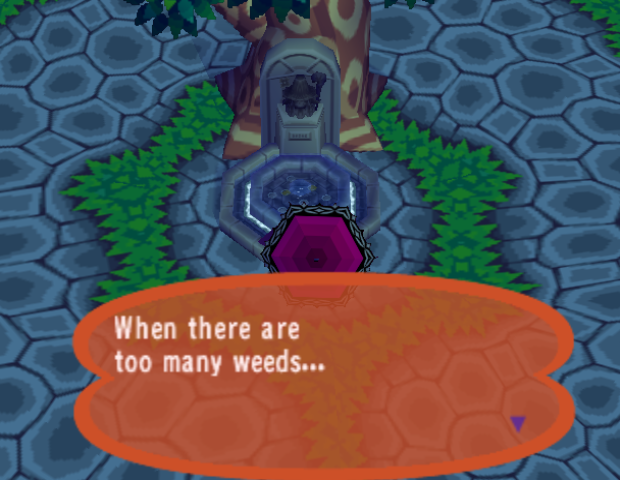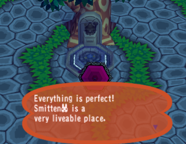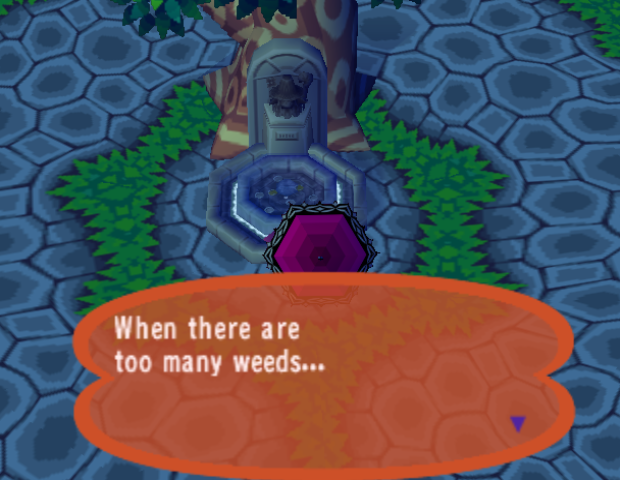 In these games, there’s a goal that you can strive for to create the perfect town, as judged by the wishing well in the town. Creating the perfect town involves removing weeds, making sure there are enough trees, making sure there aren’t too many trees, cleaning up garbage, and possibly spicing up the place with flowers? But I’ve never seen a good reference for how this is actually evaluated; just vague GameFAQs articles from 2003 that suggest there may be a scoring system.