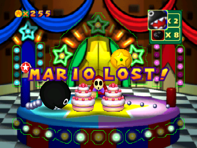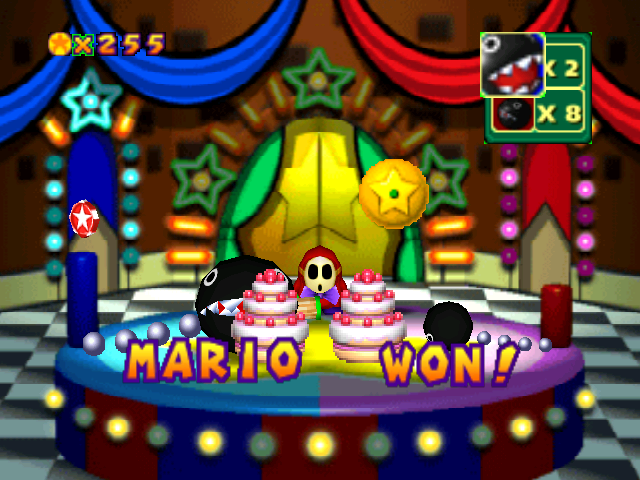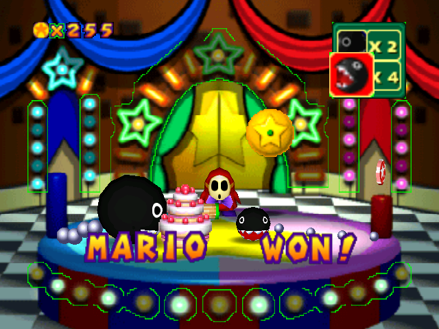 Here’s how it plays out: you land on the Shy Guy tile, all your coins are anted, and you’re given a choice to bet either on the Big Chomp finishing his cake first to double your bet, or on the Little Chomp doing so first for 4/8/16/32/64x your bet. Team Luigi chooses Little Chomp for a 32x multiplier, wins, and brings their 21-coin count up to a ridiculous 672. The game is a wash after that and they finish with 9 stars, with 2nd place sitting at 3 or 4.
